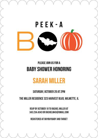 Item is available for in store pick up or special quotes for shipments. From wedding invitations to greeting cards to even custom postcards youll find the perfect card for every occasion. Guests show up with gifts. Get it as soon as Wed Oct 6. Peek a Boo Halloween Baby Shower Boo Orange Black White Maternity Sash Pumpkin Halloween Flower Sash Peek a Boo Halloween Flower Sash. Funny baby plays peek a boo with daddy and makes silly faces. Three tiered brown pale yellow sage and white baby shower cake features a peek-a-boo baby cake topper.